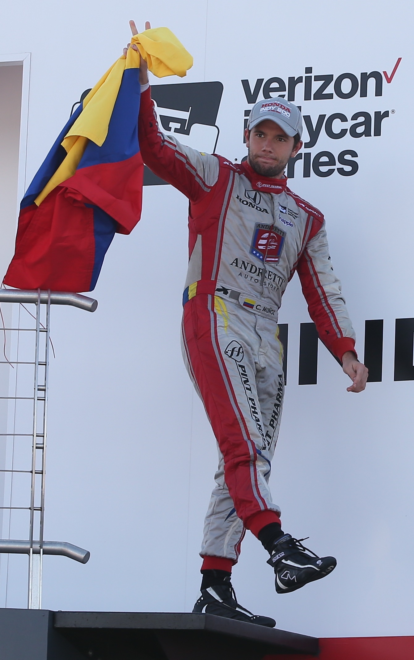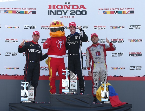 El piloto colombiano Carlos Muñoz visitó el podio de la IndyCar, al terminar en la tercera casilla de la competencia ‘Honda Indy 200 en Mid-Ohio’, tras una impresionante demostración de buen manejo y gran trabajo de su equipo, el Andretti Autosport, en la zona de boxes, lo cual le permitió pasar de la casilla 15, en donde largó, al último peldaño del podio de premiación.